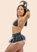 Package: 5 PC set, Headband, wrist bands, mini-skirt, bralette, and G-String (Stockings is not included).